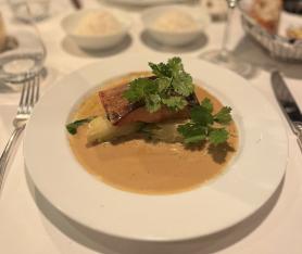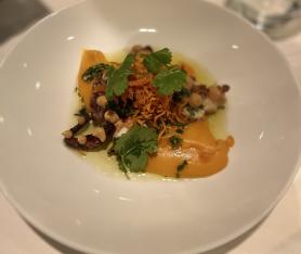 L’esprit des années folles se prolonge dans la salle du restaurant, où banquettes en velours, bougies et tableaux en noir et blanc habillent le lieu. Venons-en maintenant au coeur des assiettes ! Derrière celles-ci, on retrouve toujours le chef exécutif Nelson Vander Meuter, qui a revisité la carte avec l’aide de Vladimir Litvine. En entrée, nous optons pour le poulpe rôti et son crémeux de patates douces & chipotle. Une amorce réconfortante dont la douceur de la purée équilibre harmonieusement la texture légèrement croquante des tentacules. Quelques feuilles de coriandre viennent aussi coiffer le plat. Mais, si vous faites partie du clan qui déteste cette plante herbacée, ne vous en faites pas. Vous pourrez facilement l’enlever de votre assiette.