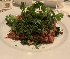 Sur la carte se côtoient aussi bien des grands classiques de la cuisine (tel le tartare de boeuf) et des inspirations puisées un peu partout dans le monde. Pour la suite, nous décidons de goûter à une nouveauté – le tataki de thon aux parfums d’Asie -, et à l’incontournable mi-cuit de saumon. Le dîner sera donc résolument marin. La fine croûte caramélisée en surface et la texture fondante du tataki révèlent une cuisson parfaitement maîtrisée. Les cacahouètes parsemées sur le thon ajoutent ce petit twist gourmand qui fait toute la différence. En revanche, si la simple vue de la coriandre vous donne des sueurs froides, évitez de commander ce plat.Il en est en effet bien garni.