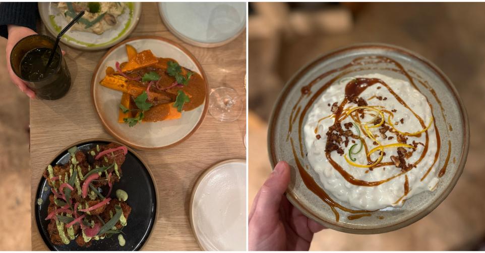 Même constat pour le dip de chou-fleur grillé, à l’huile infusée au zaatar, qui réveille un joli éventail de saveurs, relevé d’un soupçon de citron. Les patates douces à la sauce mafé se révèlent être également une plaisante révélation. Si l’on a davantage l’habitude de savourer cette sauce traditionnelle d’Afrique de l’Ouest à base d’arachide avec du poulet, sachez qu’elle se marie aussi à merveille avec les patates douces. Mais le temps fort de ce repas reste, sans aucun doute, les accras de carottes parfumés à la cardamome, au yaourt au soja et arrosés d’aji verde. Cette sauce verte apporte au plat un côté crémeux et un poil relevé. À commander impérativement lors de votre venue !