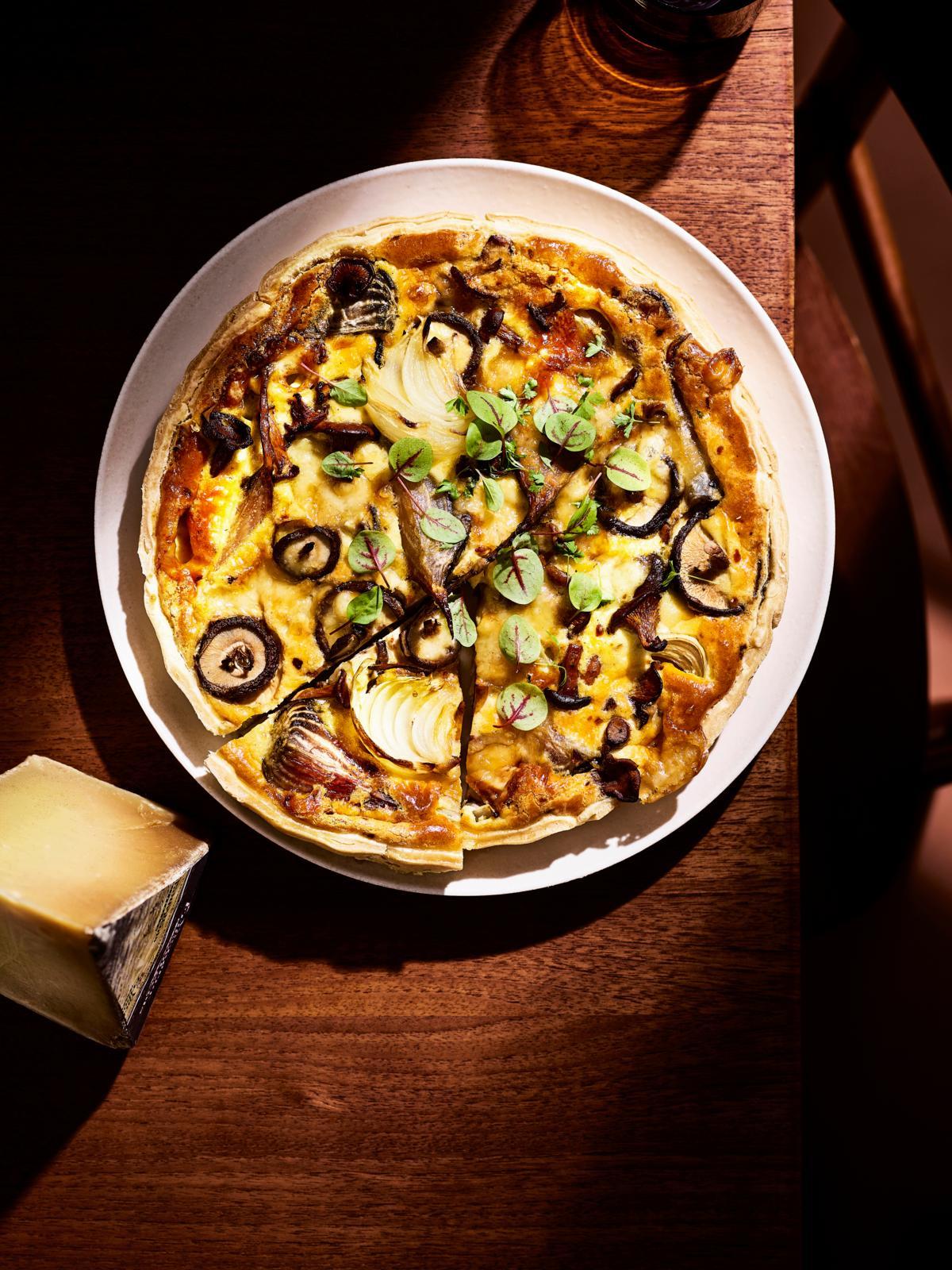 120 g de Raclette Suisse râpée • 2 oignons doux • 3 petites betteraves chioggia (ou betteraves rouges classiques) • 150 g de champignons • 1 poignée de jeunes pousses de betterave • 1 pâte brisée prête à l’emploi • 4 œufs • 120 g de yaourt grec • 120 ml de crème • 2 càs de graines de sésame grillées • 1/2 càc de flocons de piment • huile d’olive • sel, poivre