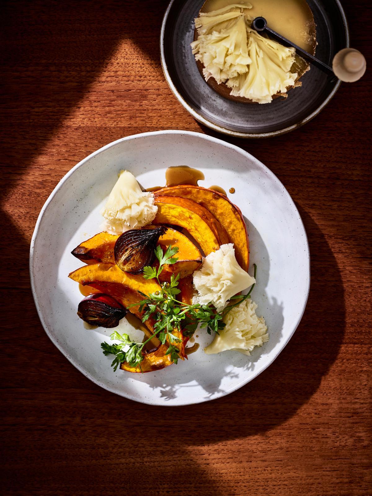 3. Répartissez les quartiers de potiron rôtis dans les assiettes. Déposez les rosettes de Tête de Moine AOP et arrosez de vinaigrette. Parsemez de persil et servez immédiatement.