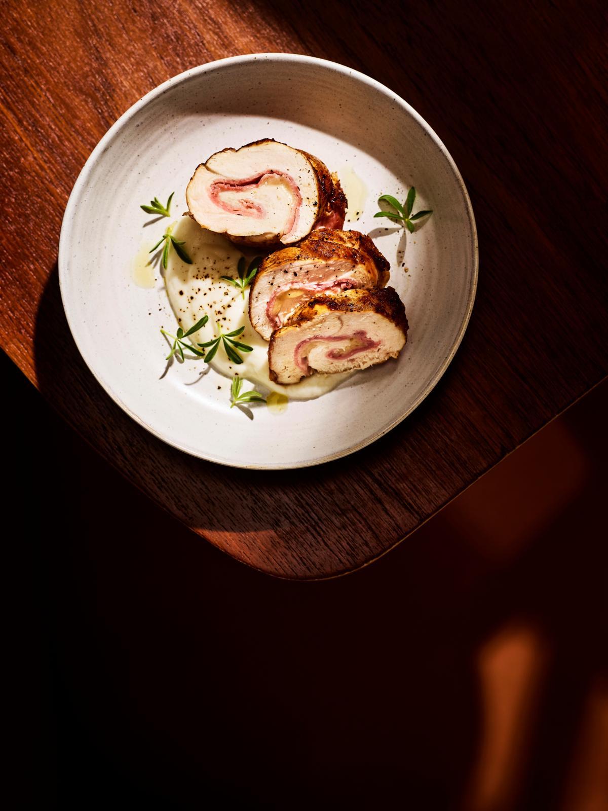 2. Ouvrez les filets de poulet dans l’épaisseur, sans les couper entièrement, et aplatissez-les délicatement entre deux feuilles de film alimentaire ou de papier cuisson. Garnissez chaque filet d’une demi-tranche de jambon et de quelques lanières d’Emmentaler AOP. Roulez les filets (serrez bien) et fixez-les avec des piques ou de la ficelle alimentaire. Faites les revenir dans un peu d’huile d’olive et poursuivez la cuisson jusqu’à ce que les cordons bleus soient bien cuits.