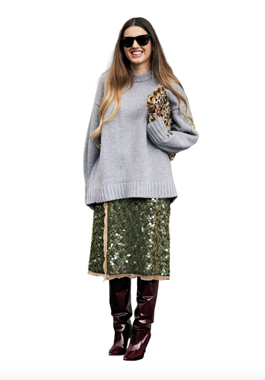 • Laissez votre robe 100 % sequins au placard et optez plutôt pour une jupe à paillettes associée à un pull en maille grise. Ce duo, omniprésent aux Fashion Weeks, est plus cool que jamais. Complétez votre look avec des bijoux argentés.