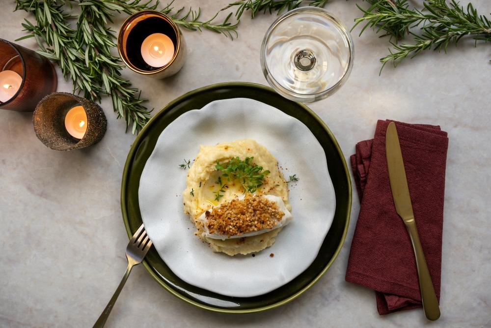 4 morceaux de poisson (cabillaud, saumon…) • 3 càs de panko • 1 càs d’huile d’olive • 2 càs de flocons de sarrasin • 700 g de panais pelé et coupé en dés • 300 g de pommes de terre farineuses pelées et coupées en dés • 1 trait de crème fraîche • 15 g de beurre • sel et poivre