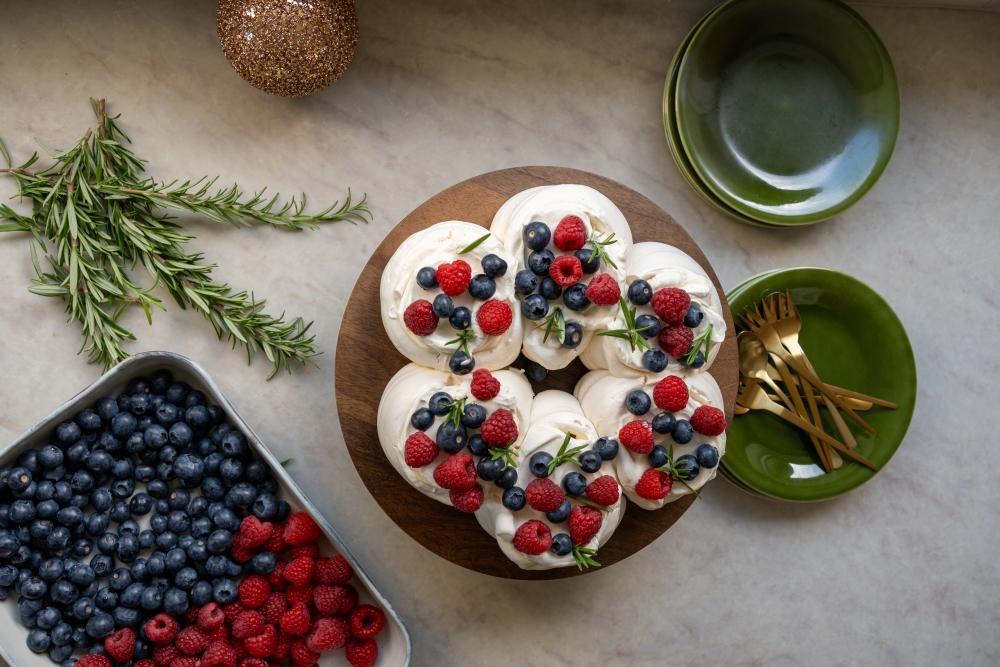 - Étaler généreusement le mélange sur le dessus de la pavlova. Décorer avec des fruits rouges et du romarin.